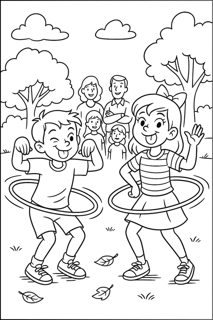 As the contest began, we were side-by-side, competing fiercely. Of course, this wasn’t just a contest of skill; it was a full-on sibling showdown. Lucy tried to break my concentration by making faces at me, sticking out her tongue, and blowing raspberries, while I retaliated by doing a ridiculous dance to distract her. Yes, I was spinning my hoop and doing the chicken dance at the same time. It was as embarrassing as it sounds, but it worked—sort of.